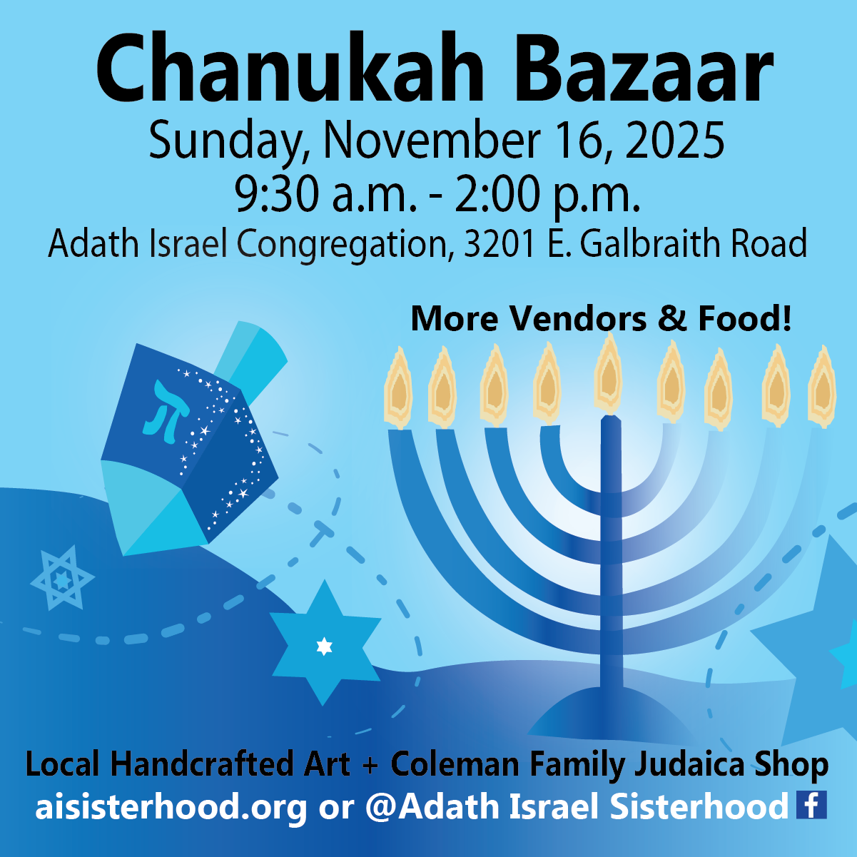Are you an artist who would like to exhibit your art at this event? Do you have questions about the Chanukah Bazaar? Please contact Heidi Weisman at weismhd@gmail.com.